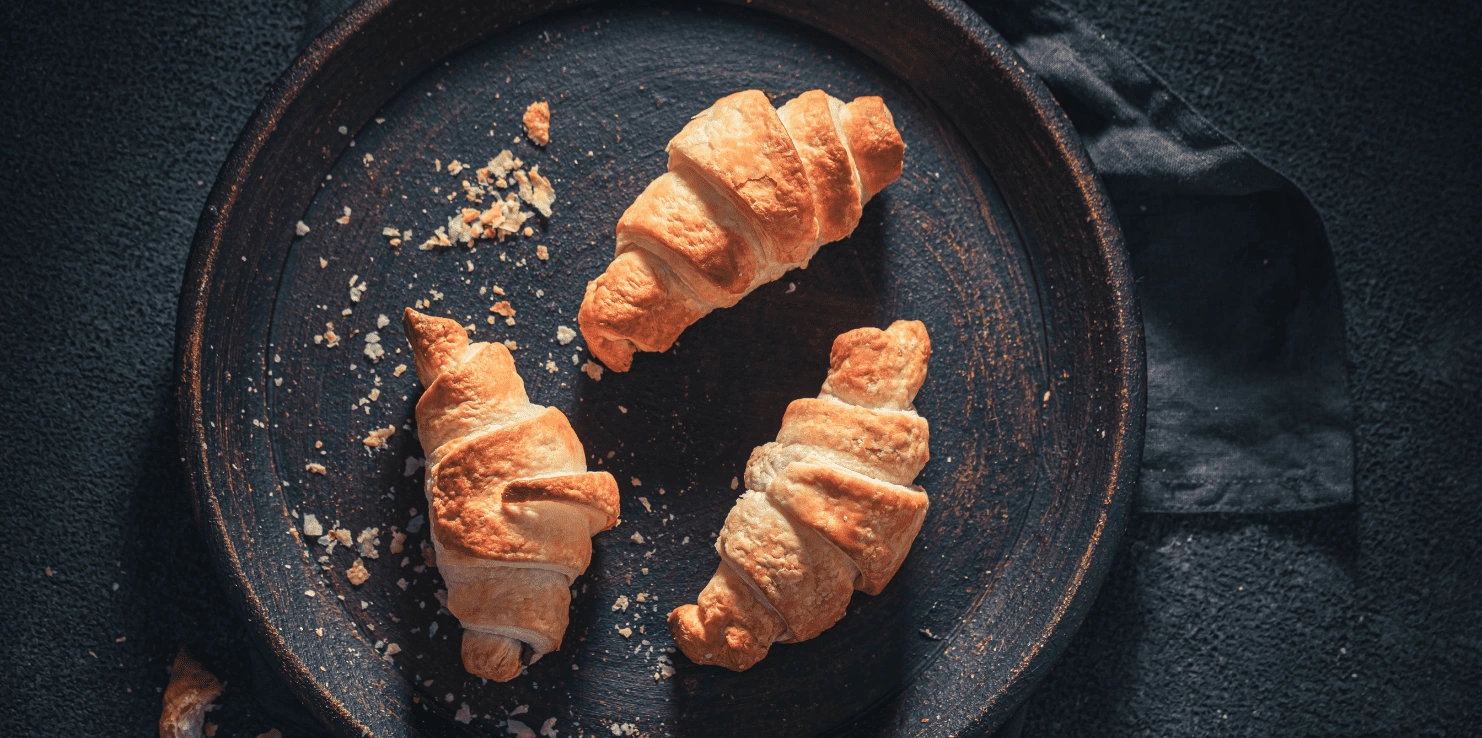 Unte uma assadeira com azeite e coloque os croissants pincelados com gema de ovo;